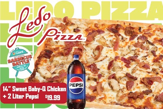 Our Buffalo Chicken Pizza is topped with LEDO & Buffalo sauces combined, Provolone cheese and roasted chicken.